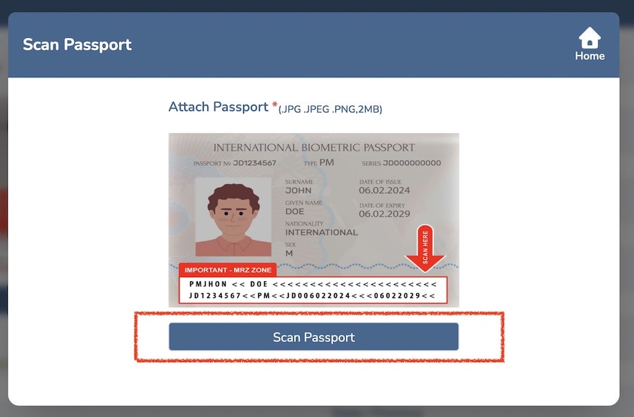 After clicking “Apply Now,” a page will open asking you to upload your passport. Click the “Scan Passport” button and select a saved photo of your passport from your device.