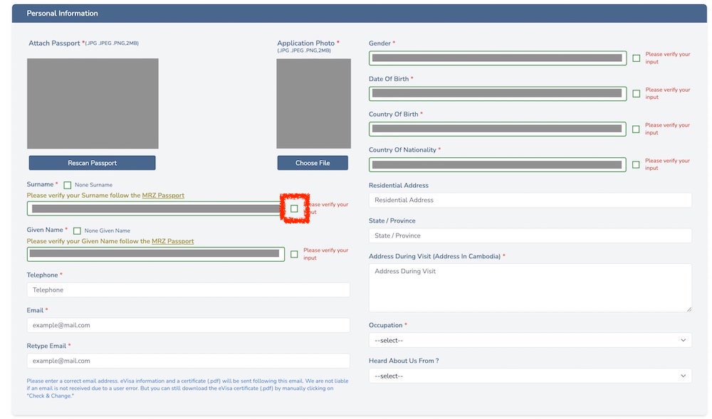 After uploading your passport, a page will appear where you’ll need to enter your personal information. The system may automatically recognize and pre-fill some of your details. Carefully check that all pre-filled information matches your passport exactly (e.g. middle names).