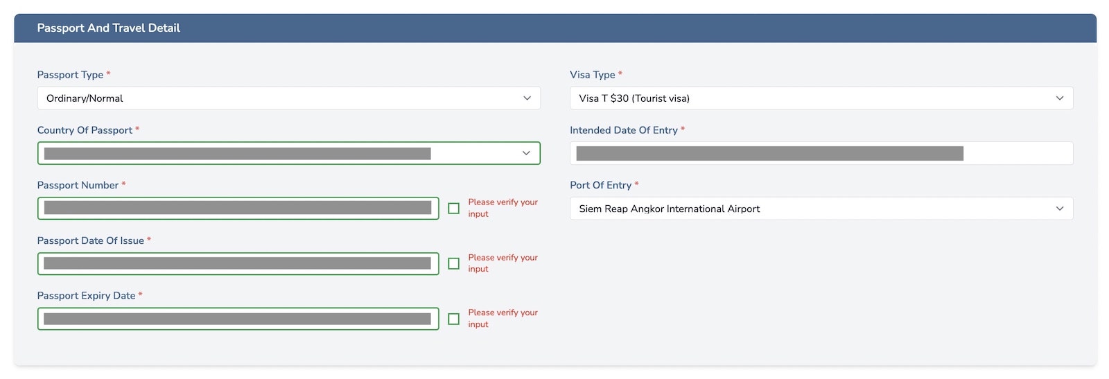 For “Visa Type,” if you’re traveling for tourism, select “Visa T $30.” Check your flight itinerary for your “Intended Date of Entry” and enter the date you arrive in Cambodia (not your departure date from your original location).
